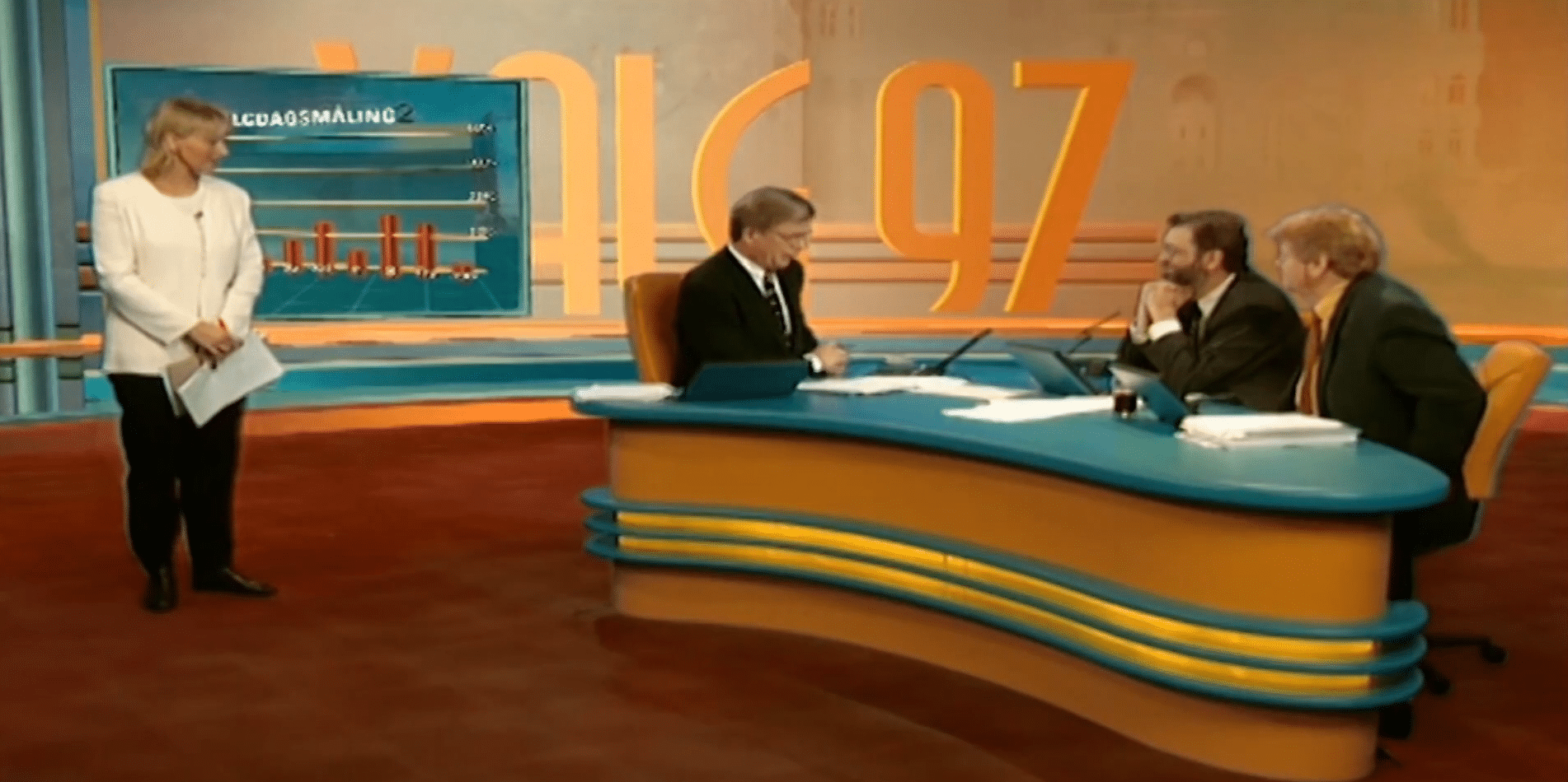 Vizrt was first involved in elections way back in the 90s. Above we see a relatively simple bar chart displaying elections graphics for TV2 Norway’s virtual set during its 1997 Norwegian general elections coverage. This was the first templated graphics system ever on television, and the technology created to help power it was the beginning of Vizrt.