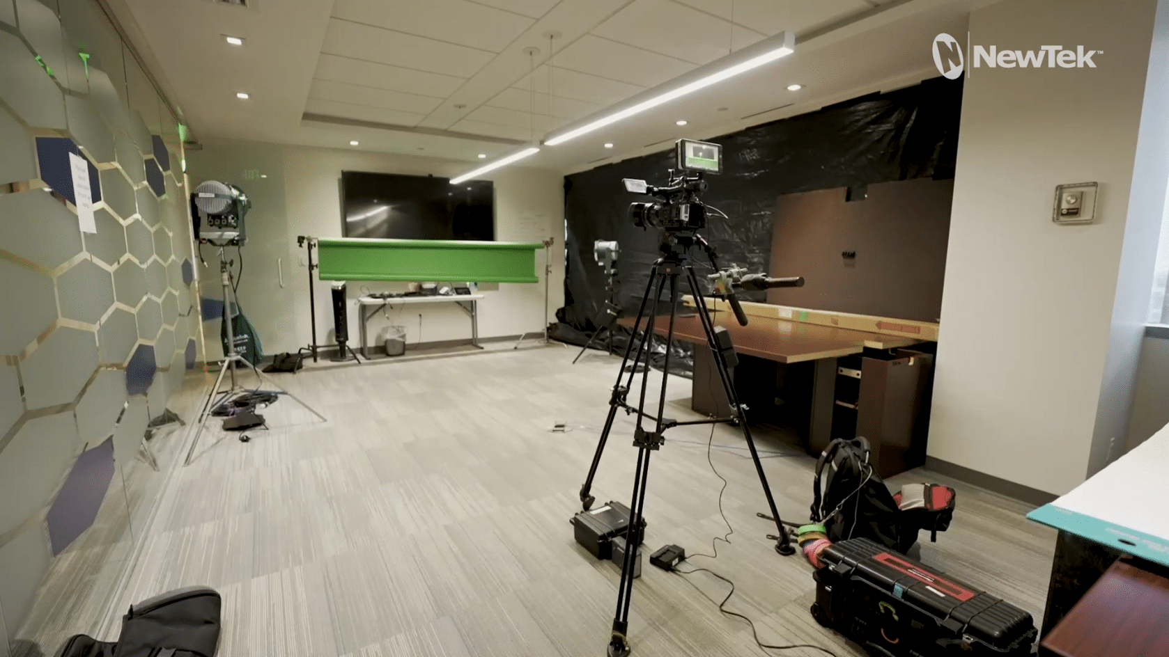 Wellington’s prep work for the 3-day meeting began two days before the meeting’s big kickoff session. “The first day was spent working with TissueTech’s IT department, networking into their system, setting up the two TriCasters, and running the Ethernet cables to make sure their network could handle us without mitigated traffic,” Wellington says. “On day two, I brought in the grip, lighting and production crews and we built the four cameras and lit the two green screen sets. Then we fleshed out the control facility with audio and teleprompter.”