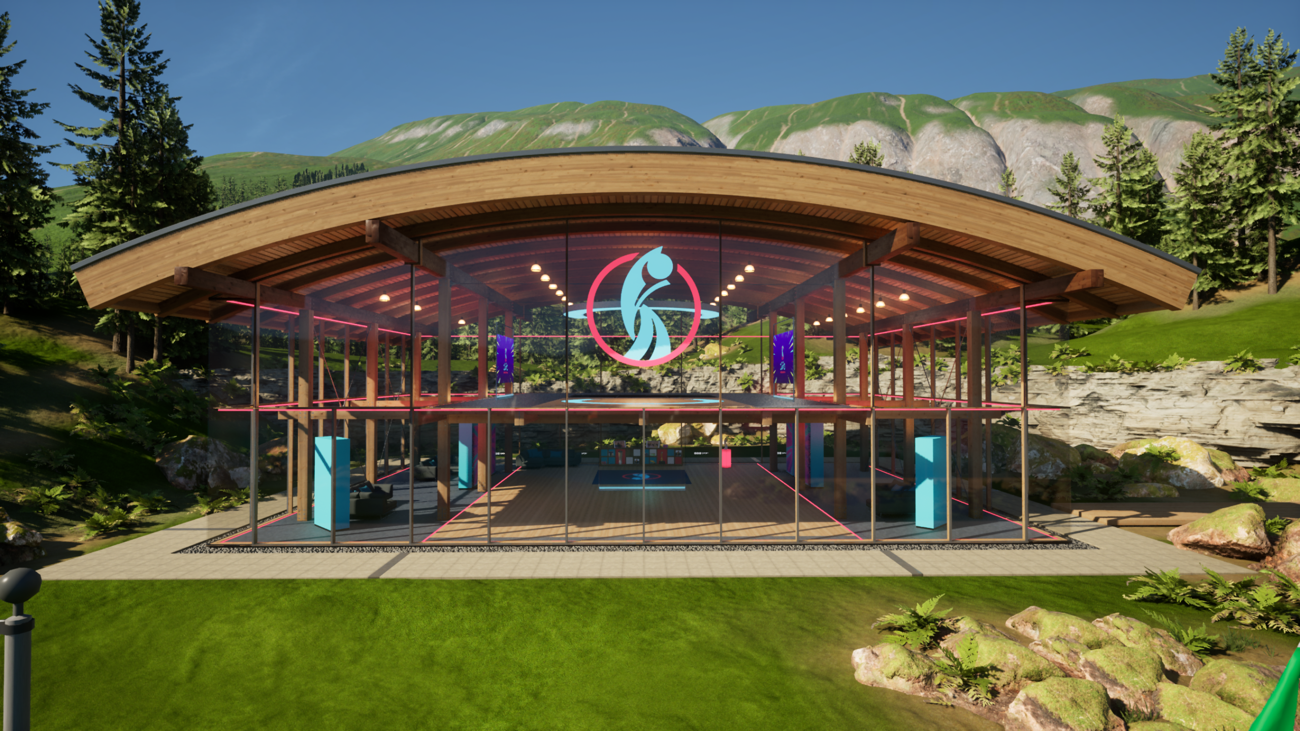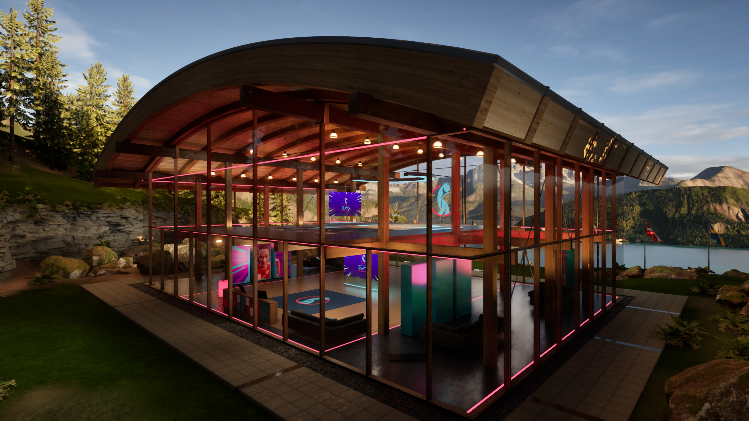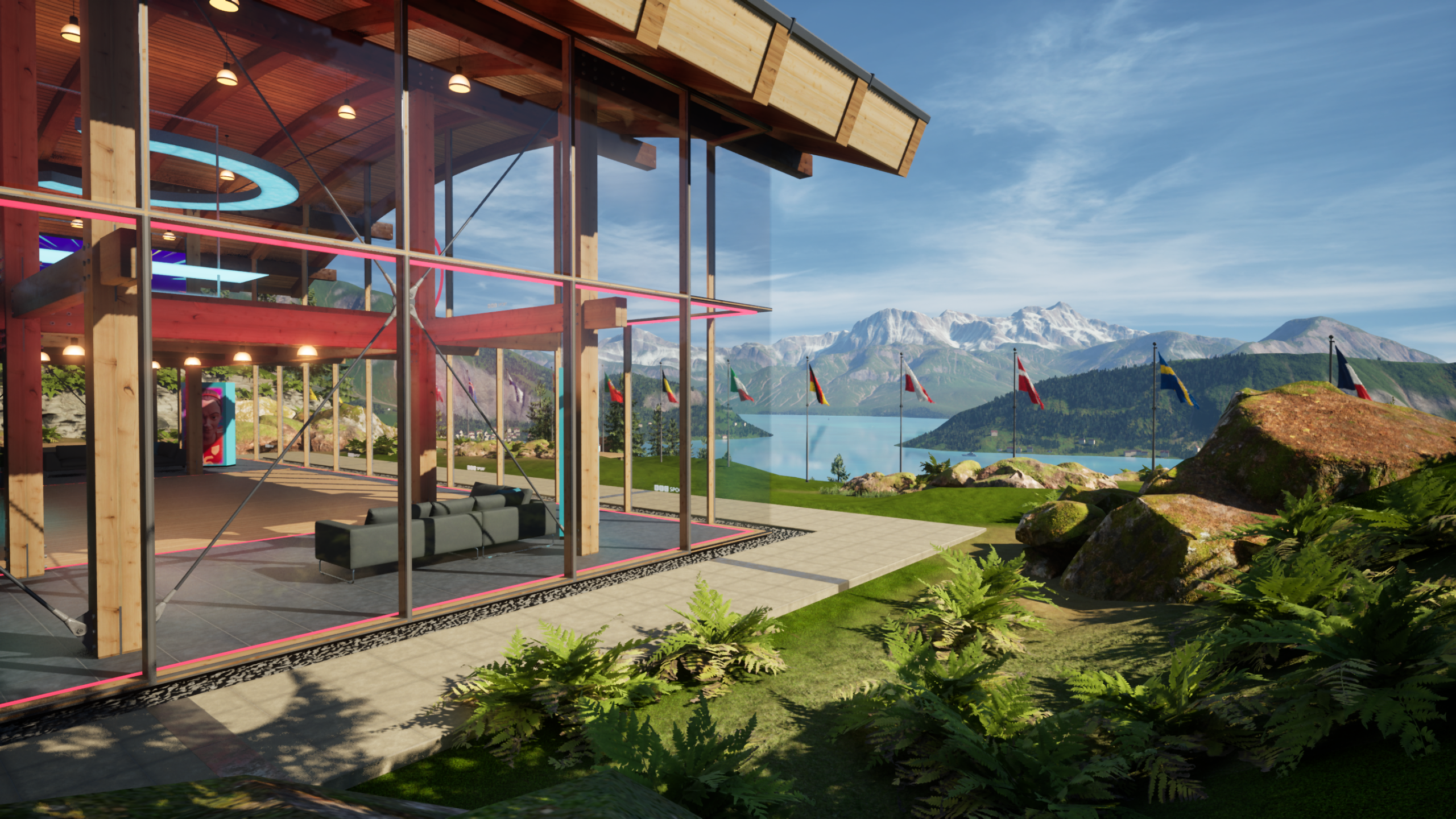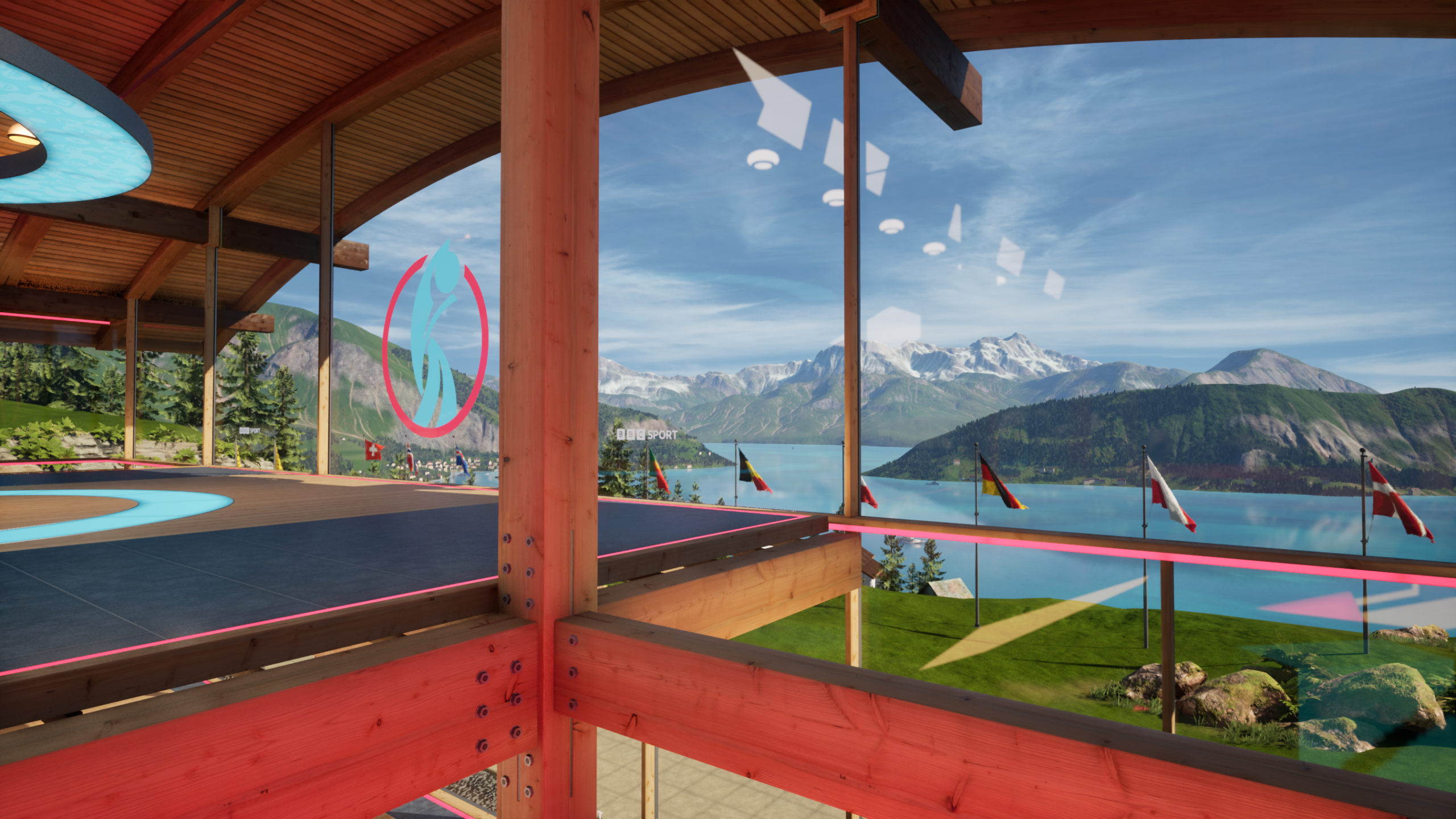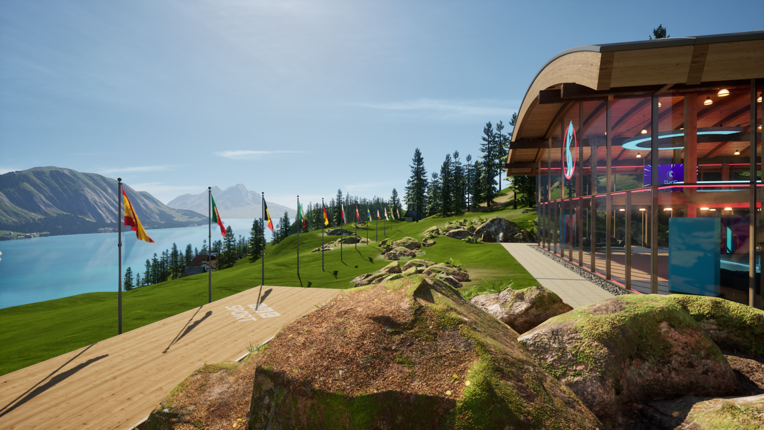 Designed to reflect the Swiss setting of the tournament, the virtual set placed presenters in a mountaintop pavilion overlooking Lake Lucerne. Behind them were sweeping alpine views, fluttering national flags, and soft skies shifting to reflect the time of day. The XR studio became more than a backdrop, it helped ground the coverage in the look and feel of Switzerland, while giving producers the flexibility of a fully virtual environment.